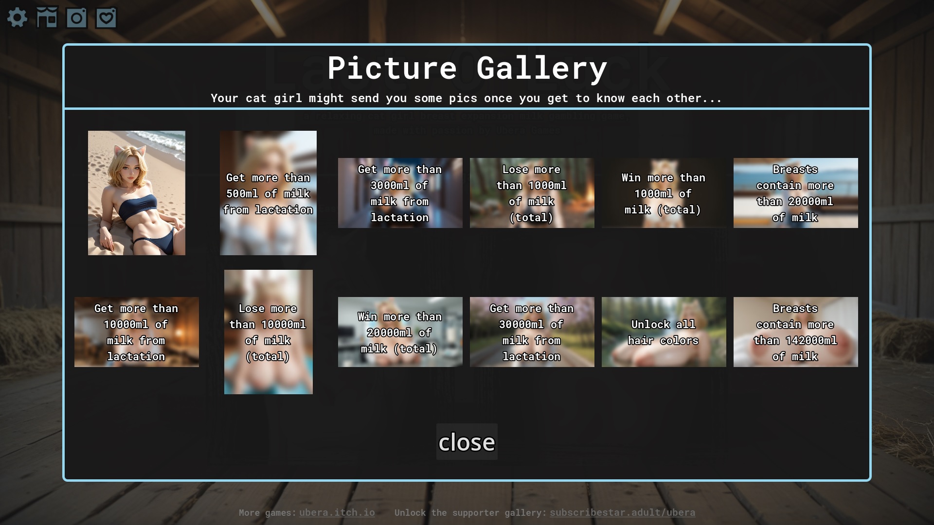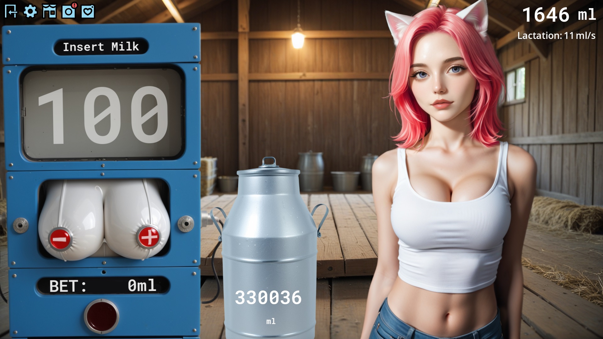 Milk your cat girl and use her milk in the Lact-O-Luck milk gambling machine! Gamble more or let your cat girl drink the milk to increase her lactation and breast size. Play at your own pace without any time pressure for a relaxing experience. Can you beat the machine and grow your cat girl's breasts to the size she desires? 😼
